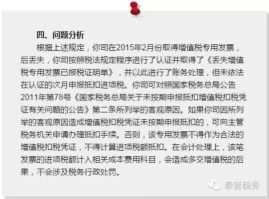 问:我司2月份的时候收到供应商的发票,当时因我司的原因将此发票遗失,对方公司在5月份的时候向其国税局开具了一份《已报税证明单》给我司,我司当时就入账处理了。但现在我司才发现,我们没有及时将那份发票进行进项税抵扣,造成现在,该发票已经过了抵扣期限,不知道现在是否可以再向税局申请抵扣税金?会不会有处罚等条款?符不符合申请抵扣的范围? 答:你司取得增值税专用发票,已经认证但未按照税法规定的期限进行申报抵扣。 国税函[2009]617号《国家税务总局关于调整增值税扣税凭证抵扣期限有关问题的通知》第四条规定,增值税一般纳税人丢失已开具的增值税专用发票,应在本通知第一条规定期限内,即在开具之日起180日内,按照《国家税务总局关于修订〈增值税专用发票使用规定〉的通知》(国税发[2006]156号)第二十八条及相关规定办理。 国家税务总局在2014年3月24日发布公告,自2014年5月1日起,《国家税务总局关于修订〈增值税专用发票使用规定〉的通知》(国税发[2006]156号)第二十八条废止。一般纳税人丢失专用发票按照国家税务总局公告2014年第19号《国家税务总局关于简化增值税发票领用和使用程序有关问题的公告》第三条的规定办理。 国家税务总局公告2014年第19号《国家税务总局关于简化增值税发票领用和使用程序有关问题的公告》第三条规定:一般纳税人丢失已开具专用发票的发票联和抵扣联,如果丢失前已认证相符的,购买方可凭销售方提供的相应专用发票记账联复印件及销售方主管税务机关出具的《丢失增值税专用发票已报税证明单》或《丢失货物运输业增值税专用发票已报税证明单》(附件1、2,以下统称《证明单》),作为增值税进项税额的抵扣凭证;如果丢失前未认证的,购买方凭销售方提供的相应专用发票记账联复印件进行认证,认证相符的可凭专用发票记账联复印件及销售方主管税务机关出具的《证明单》,作为增值税进项税额的抵扣凭证。专用发票记账联复印件和《证明单》留存备查。 根据国税函[2009]617号《国家税务总局关于调整增值税扣税凭证抵扣期限有关问题的通知》第一条规定,增值税一般纳税人取得2010年1月1日以后开具的增值税专用发票、公路内河货物运输业统一发票和机动车销售统一发票,应在开具之日起180日内到税务机关办理认证,并在认证通过的次月申报期内,向主管税务机关申报抵扣进项税额。第三条规定,增值税一般纳税人取得2010年1月1日以后开具的增值税专用发票、公路内河货物运输业统一发票、机动车销售统一发票以及海关缴款书,未在规定期限内到税务机关办理认证、申报抵扣或者申请稽核比对的,不得作为合法的增值税扣税凭证,不得计算进项税额抵扣。 国家税务总局公告2011年第78号《国家税务总局关于未按期申报抵扣增值税扣税凭证有关问题的公告》规定,增值税一般纳税人取得的增值税扣税凭证已认证或已采集上报信息但未按照规定期限申报抵扣,属于发生真实交易且符合本公告第二条规定的客观原因的,经主管税务机关审核,允许纳税人继续申报抵扣其进项税额。 (一)因自然灾害、社会突发事件等不可抗力原因造成增值税扣税凭证未按期申报抵扣; (二)有关司法、行政机关在办理业务或者检查中,扣押、封存纳税人账簿资料,导致纳税人未能按期办理申报手续; (三)税务机关信息系统、网络故障,导致纳税人未能及时取得认证结果通知书或稽核结果通知书,未能及时办理申报抵扣; (四)由于企业办税人员伤亡、突发危重疾病或者擅自离职,未能办理交接手续,导致未能按期申报抵扣;