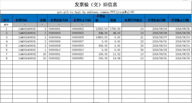 温馨贴士:现已开通增值税专用发票 、增值税普通发票验旧,后续将陆续推出更多,请继续保持关注。1.为了更好地完善您的办税体验,缩短您的办税时间,请务必提前下载《发票验(交)旧信息表》(电子档),并按照标准格式填列开票汇总数据,然后一并携带发票验旧信息电子文档及需要验旧的所有发票以及相关税控设备(金税盘、税控盘、报税盘)等前往大厅办理验旧;2.表格下载路径:上海税务网站-纳税服务-表格下载-《发票验(交)旧信息表》;表格必填要素:发票代码、份数、发票起始号码、发票终止号码、开票金额、发票开具情况、开票起始日期、开票截至日期等。在浦东税务子网站或大厅自助办税区电脑,下载《发票验(交)旧信息表.xls》Excel表格至U盘,打开显示如下:企业应将需要验旧的发票的发票代码、发票份数、发票起始号码、发票终止号码、开票金额、税额、发票开具情况、开票起始日期、开票截止日期等信息如实依次填入表格。2、发票数量必须如实填写。确保发票数量与发票起止号段一致,如有误则无法通过验旧。3、发票起始号码、发票终止号码应为“文本”格式,且一定要满足“八位”,不满“八位”前面可用数字“0”填充。如:需要验旧的发票号码为“789456”,不满八位,填表时必须填写为“00789456”。5、“发票开具情况”栏,应填写代码,具体代码与开具情况对应关系如下:6、“开票起始日期、开票截止日期”格式只能为:XXXX/XX/XX。且“开票起始日期”、“开票截止日期”的时间跨度只能为整月。如,企业需验旧同一票种的发票在5月份、6月份都有开具,那么5月份开的发票在“开票起始日期、开票截止日期”填写时,应填写2016/05/01——2016/05/31之间;6月份开的发票在“开票起始日期、开票截止日期”填写时,应填写2016/06/01——2016/06/30之间某一般纳税人企业2016年5月1日—2016年6月30日开具代码为144001400001的发票10张,开具代码为144001400002的国税通用定额发票(壹拾元)1本,其中5月开具20张,6月开具30张。上述发票需要验旧。具体开票情况为:发票号码1——3的发票为正常开具;其中1号发票开具日期为5月16日,价税合计金额为11700元;2号发票开具日期5月18日,价税合计金额为630元;3号发票开具日期为6月6日,价税合计金额为848元。发票号码4——5的发票为已开具但因种种原因作废;4号发票开具日期为6月7日,价税合计金额为10000元;5号发票开具日期为6月10日,价税合计金额800元。发票号码8——9的发票为未按规定开具的发票(具体规定见《发票管理办法》及其《实施细则》)。8号发票开具为6月10日,价税合计金额500元;9号发票开具日期为6月11日,价税合计金额300元。发票号码10的发票为其他错误原因。10号发票开具日期为6月15日,价税合计金额200元。